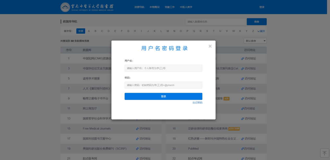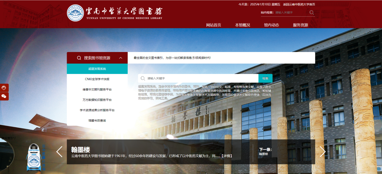 (一)访问图书馆官方网站:http://www.tsg.ynucm.edu.cn/,进入图书馆主页。