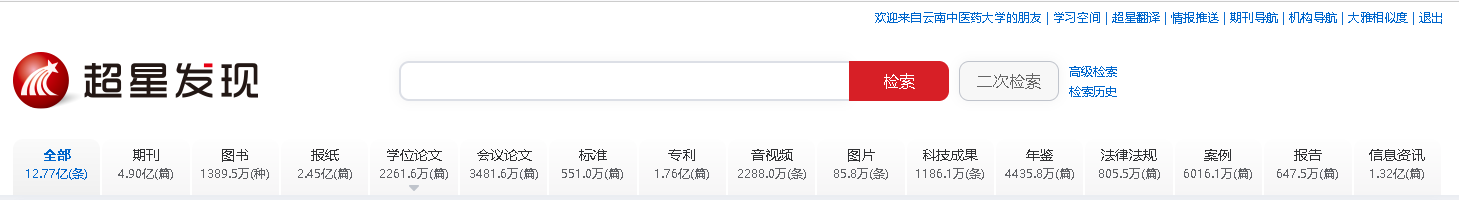 本校师生可以通过超星发现系统查找到海量的图书、期刊、报纸、学位论文、会议论文、标准、专利、音视频等各类文献资源。