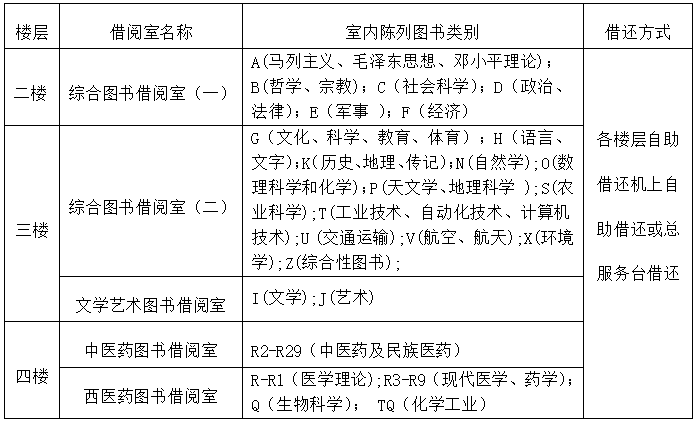 对图书馆内五间借阅室的所有图书进行自助借还服务,各借阅室內将不再提供人工借还服务。借阅室名称、室内陈列图书类别、借还方式如下: