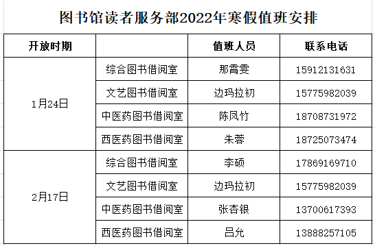 寒假期间,图书馆各间图书借阅室于1月24日和2月17日两天开放,值班时段为8:30—11:30;13:30—17:00,具体受理图书借还、读者咨询和室内阅览等服务工作。假期间公共自习区正常开放。