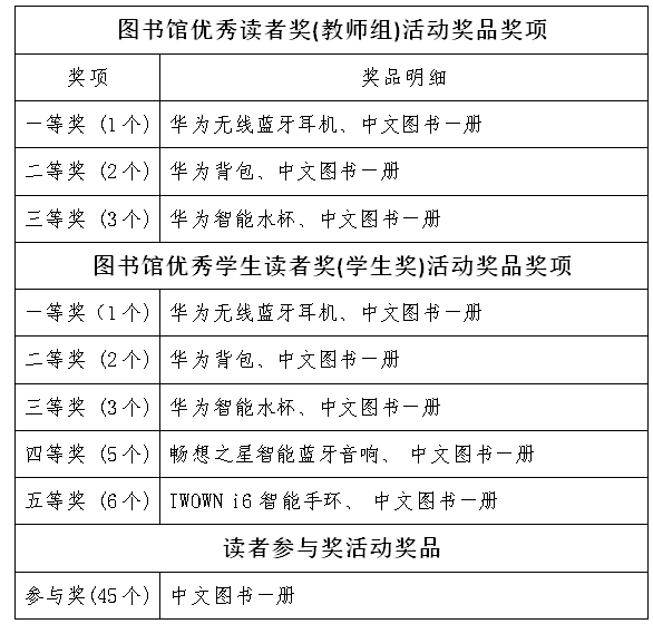 3、读者参与奖:活动期间累积荐购收录入馆藏图书的读者除优秀教师读者和优秀学生读者外按排名顺位选取(教师取15名,学生取30名),共45名 。