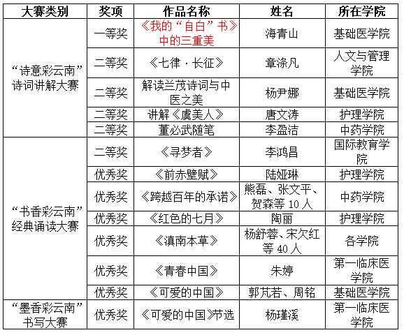 根据《教育部办公厅关于举办第三届中华经典诵写讲大赛的通知》(教语用厅函[2021]21号)精神,云南省教育厅、云南省语言文字工作委员会举办的第三届“云岭杯”中华经典诵写讲大赛近日落下帷幕。由我校图工委、校语委组织参赛的13项作品全部获奖,斩获一等奖1个,二等奖5个,优秀奖7个,具体获奖名单附后。