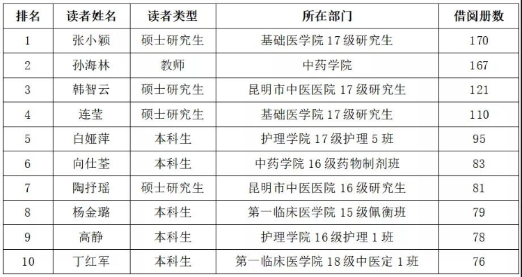 阅读是终身学习的基础,是自主学习的重要形式。为发挥图书馆读书文化育人的功能,引导学生自主学习,促进综合素质提高,提高资源利用率,推进“书香云中”校园建设。根据2019年全年借阅数据,经图书馆审核、学校领导批准,决定授予张小颖等10位读者为2019年度云南中医药大学“阅读之星”荣誉称号,具体名单如下: