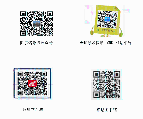 图书馆已开通全球学术快报(CNKI移动平台)、超星学习通、维普“中文期刊助手”APP、移动图书馆等数字资源移动服务平台,扫描下方二维码下载APP登陆使用。超星学习通、移动图书馆、超星期刊(可校外访问)使用借阅证账号密码登陆使用,维普“中文期刊助手”APP、全球学术快报(CNKI移动平台)自主注册登陆后在校园网范围内位置关联后使用。