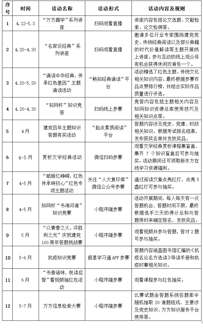 各活动具体开展时间和活动内容的详细文案将在图书馆微信公众号上陆续发布,活动内容丰富、奖品丰厚,欢迎全校师生积极参与!