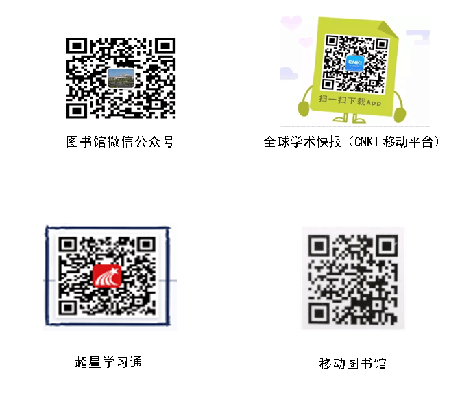 图书馆已开通全球学术快报(CNKI移动平台)、超星学习通、移动图书馆等数字资源移动服务平台,扫描下方二维码下载APP登陆使用。超星学习通、移动图书馆使用借阅证账号密码登陆使用,全球学术快报(CNKI移动平台)自主注册登陆后在校园网范围内位置关联后使用。详细使用方法可登录图书馆网站查询或email咨询42643075@qq.com。
