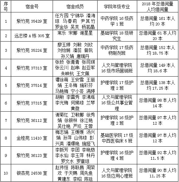 为了进一步加强学校的学风和舍风建设,营造“书香云中”的和谐校园悦读氛围,丰富和活跃校园文化,提高大学生的人文素养,培养大学生正确的人生观、价值观,在全校各学生宿舍积极踊跃申报的基础上,经图书馆组织评审和学校领导批准,决定授予紫竹苑35429宿舍等10个宿舍为云南中医药大学“十佳书香宿舍”,并将于4月23日世界读书日活动当天举行表彰、授牌和奖励仪式,获得云南中医药大学“十佳书香宿舍”荣誉称号的名单如下: