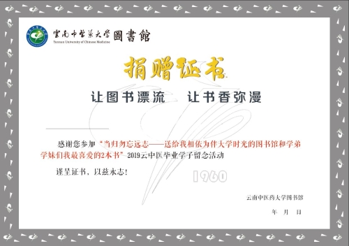 对所有捐书在2本及以上的师生,图书馆将颁发云南中医药大学图书馆盖章的“捐赠证书”以示感谢和留念(见附件)。