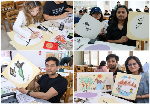 接下来的“以画会友”中国绘画体验环节,同样精彩纷呈。在张老师的指导下,留学生们以水墨为媒,勾勒山水、泼墨花鸟,在留白与渲染间体悟“道法自然”的东方哲学意境。创作出了一幅幅生动的山水花鸟作品,紧接着参与者们在作品题上汉字落款,将水墨氤氲的东方哲思与个人文化记忆交织,成为跨文化对话的生动注脚。