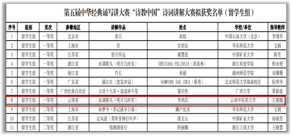 近日,在国家教育部、国家语言文字工作委员会联合主办的第五届中华经典诵写讲大赛“诗教中国”诗词讲解大赛中,国际教育学院2019级留学生李鸿昌斩获留学生组一等奖。