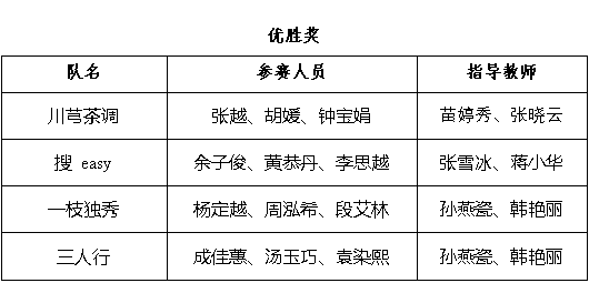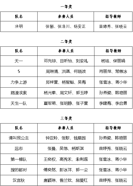 根据省赛评审规则,我校共斩获一等奖1个,二等奖5个,三等奖5个,优胜奖4个,同时我校荣获本次大赛“优秀组织奖”,常傲冰、保丽娟、张雪冰被评为“优秀组织工作者”,苗婷秀、张晓云被评为“优秀指导教师”。具体获奖名单如下: