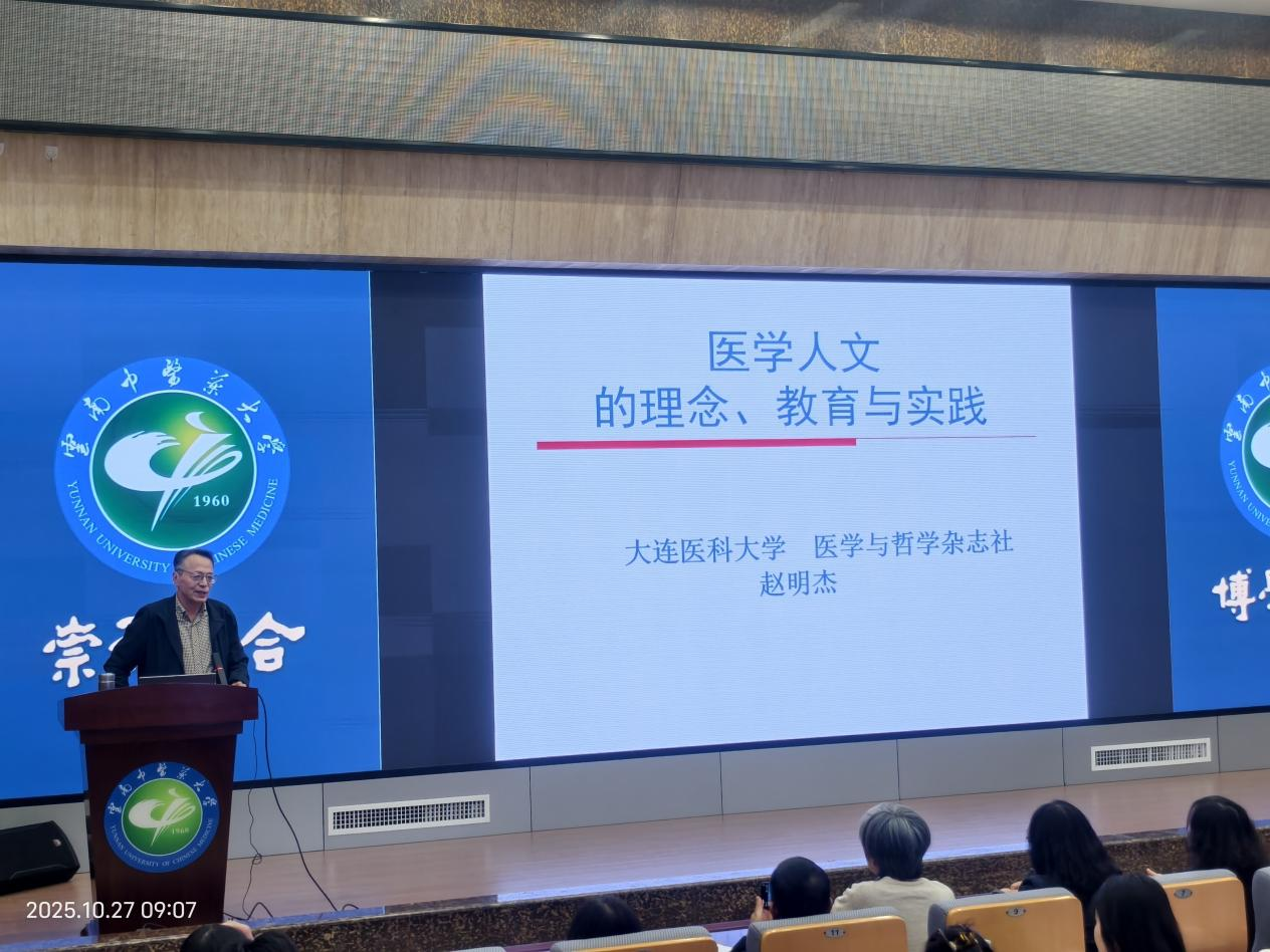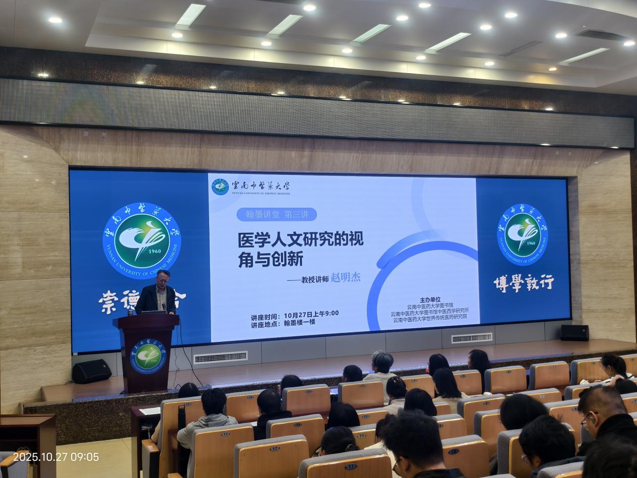 2025年10月27日上午,云南中医药大学翰墨讲堂第三讲如期举行。本次讲座以“医学人文研究的视角与创新”为主题,由学校图书馆主办,中医西学研究所、世界传统医学研究院承办,特邀教授、主任医师、博士生导师、《医学与哲学》杂志常务主编赵明杰担任主讲嘉宾,160多名师生齐聚翰墨楼一楼报告厅,共同聆听这场兼具理论深度与实践价值的学术分享。