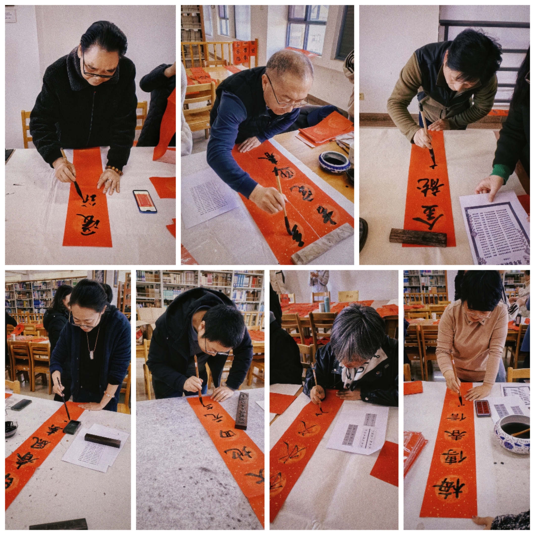 学校第二附属医院莫德敏、徐万所、蔡定格、李应志、黄万琳及图书馆肖丽萍老师,旅法华裔画家马群先生等现场泼墨挥毫,为学校教职工献上了上百幅新春对联。现场部分师生书法爱好者也加入书写,交流书法技艺。