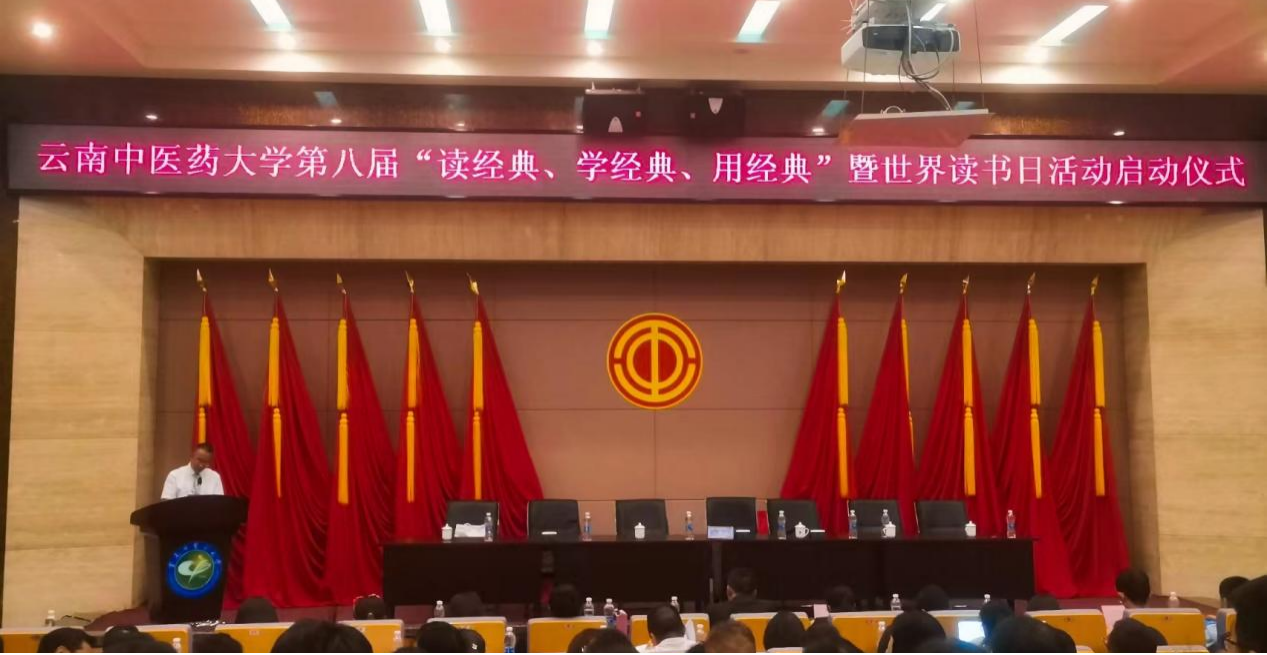 云中讯(图书馆)人间四月好芳菲,春光烂漫满校园。4月23日上午,云南中医药大学第八届“读经典、学经典、用经典”暨世界读书日活动启动仪式在呈贡校区翰墨楼一楼报告厅举行,副校长温伟波、教师代表、学生代表及图书馆教师200余人参加了启动仪式。仪式由图书馆馆长常傲冰主持。