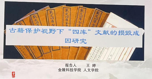金陵科技学院人文学院王婷老师从多个维度介绍了“四库”文献的损毁成因,从社会到自然,各种因素的综合影响,导致“四库”文献在流传的过程中未能完整的保存下来。在新时代,为了充分保护珍贵古籍,发掘内含价值,最后王老师提供了四种保护性措施,为我馆的古籍保护提供了新的思路。