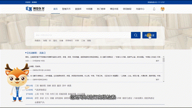 5)除此之外,您还可以进行高级检索,如检索中医古籍,输入相应的检索信息,可以根据实际需要来添加或删减检索字段,可勾选相应的成书朝代,同时,可勾选您权限范围内的数据库,默认检索全部数据库。