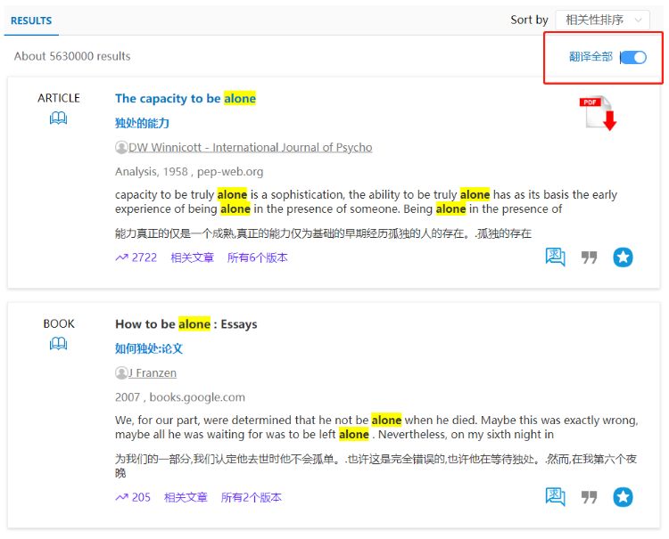 据平台对收录资源的篇名/标题与摘要进行翻译。读者只需点击检索结果列表上方的“翻译”选项,即可显示当前页面全部检索结果篇名/标题与摘要的汉语翻译。