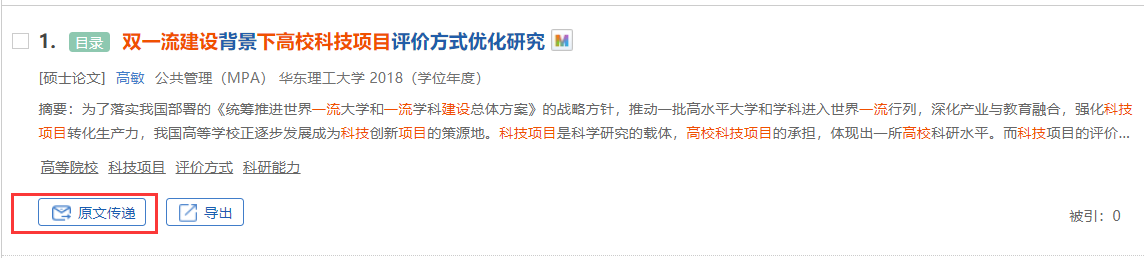 平台资源的获取方式包括在线阅读、全文下载和原文传递。以新增的ISTIC资源为例,用户可以通过原文传递方式来获取全文。获取步骤如下:
