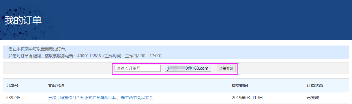 (3)访问订单查询网站,输入订单号或者申请原文传递时所填邮箱地址进行查询。(订单查询网站链接如下:http://new.istic.wanfangdata.com.cn/Order )