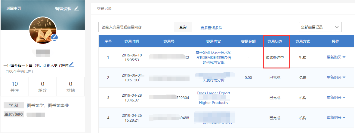 (1)建议用户申请传递时登陆个人账号,申请传递的订单的状态则可在个人中心查看:个人中心-全部交易记录-交易状态。