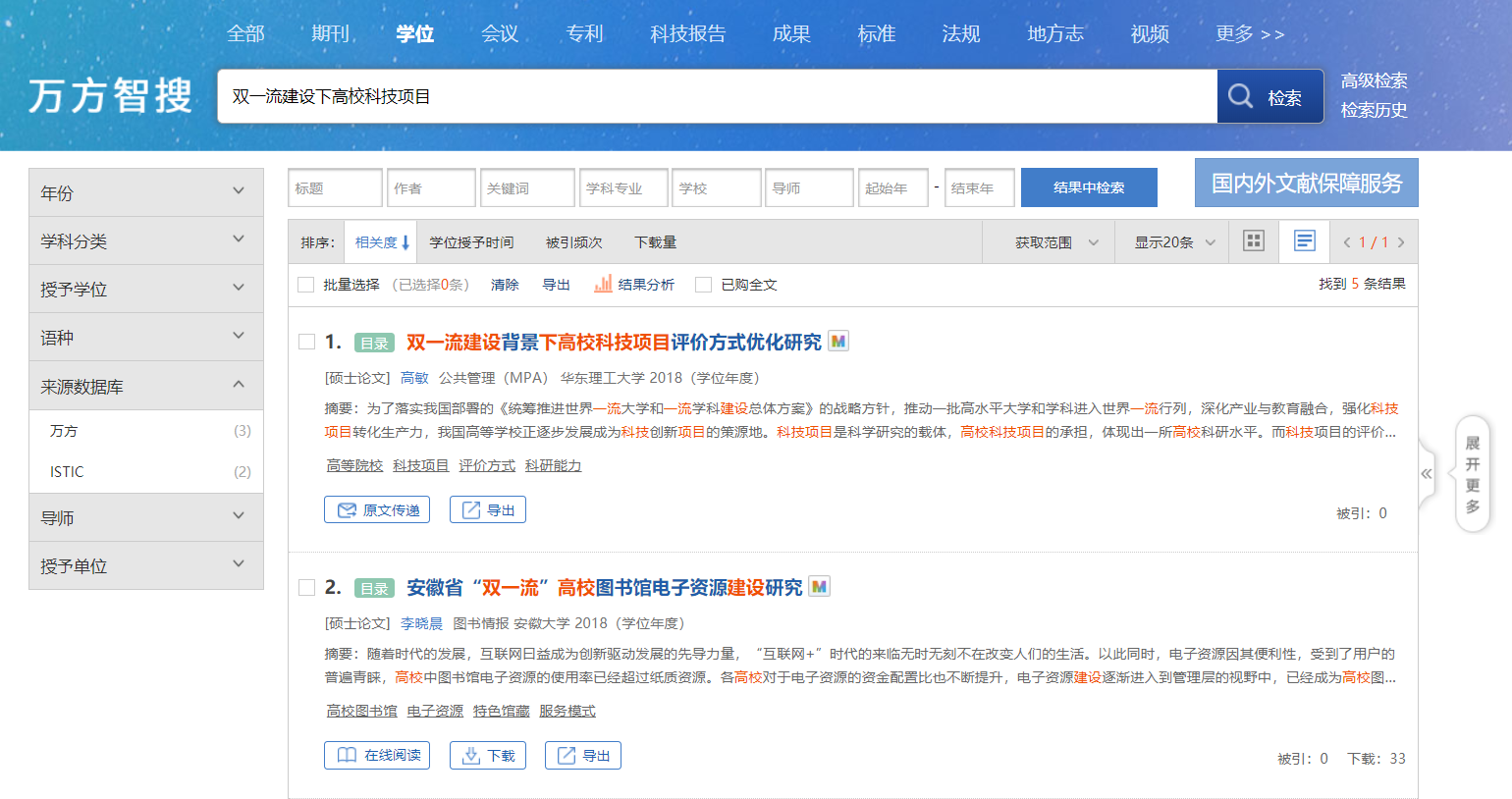 万方数据知识服务平台以融汇、开放、智能、触达为关键词,加速实现从传统文献保障服务向文献渠道保障服务的升级转型。通过强化与中国科学技术信息研究所的战略合作,不断提升对多源异构资源的整合、组织与发现能力,通过全文下载、原文传递等服务形式全面升级原中国学位论文全文数据库,打造增强版学位论文服务系统,以实现价值学术资源的覆盖、揭示与获取。