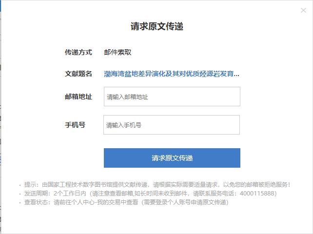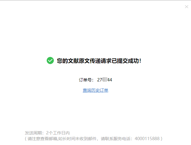第三步,完成原文传递请求。传递时间视实际服务情况而定。一般2小时—2个工作日内能收到原文邮件,如超过2个工作日仍未收到,可联系服务电话:4000115888。