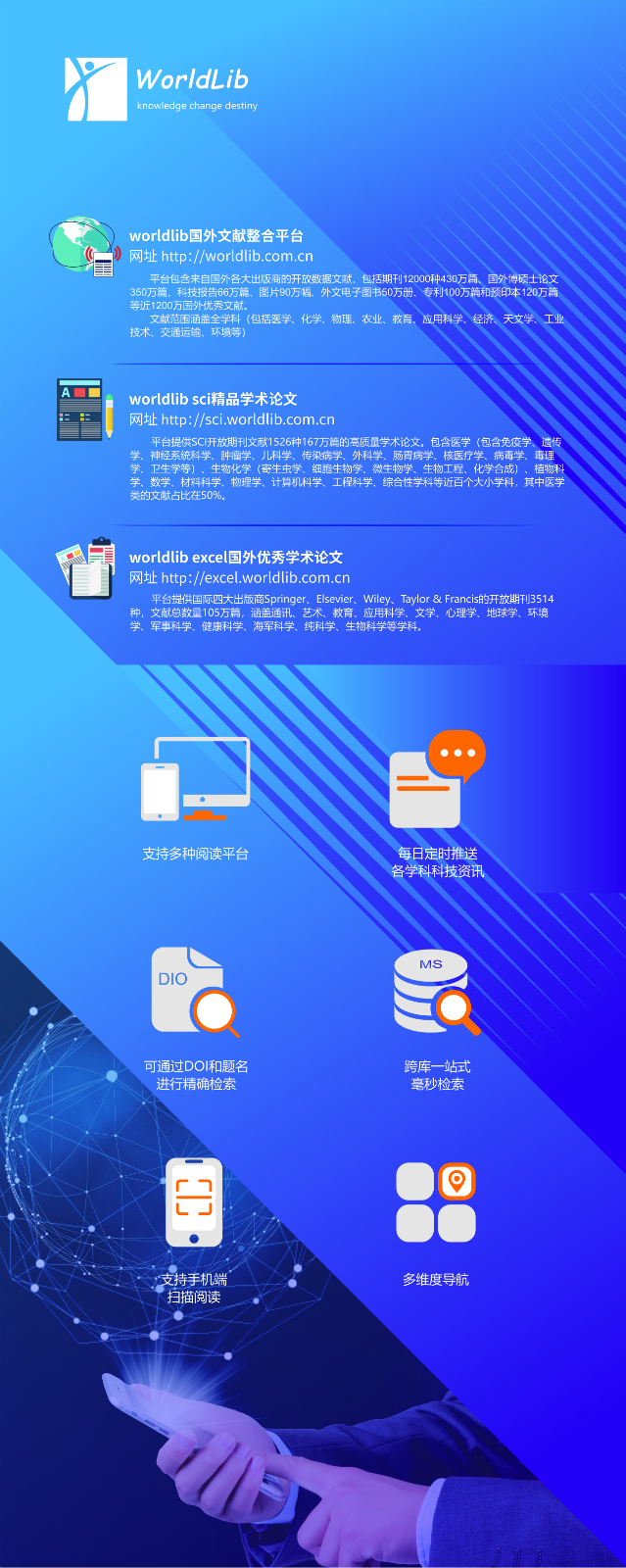 worldlib国外文献整合平台整合了国外各种开放数据,可实现一站式查询检索,所查询的文献均可下载全文数据,支持二维码手机端下载阅读。该平台目前整合了430万篇期刊、350万篇博硕论文、40万种电子图书、90万幅图片库、66万篇科技报告、专利100万篇、预印本100万篇,外文文献数量接近1200万,后续会发布国外公开课等各类文献,以满足不同用户对文献数据的需求,数据会定期更新。