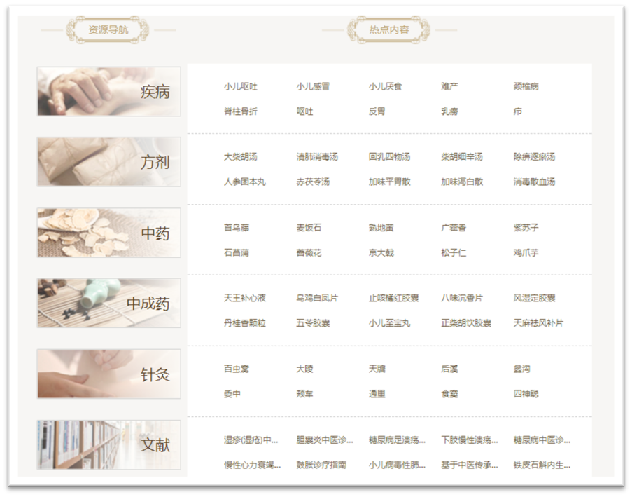 中医药知识库整合了方剂巨著《中华医方》,以病症为纲目,收录了1145条中医病症、98085条中医方剂,囊括各种疾病的古今治疗方剂。每条方剂在有据可考的前提下均有详尽的记述,包括方名、来源、别名、组成、用法、功用、主治、宜忌、加减、方义、实验、验案、备考等内容。