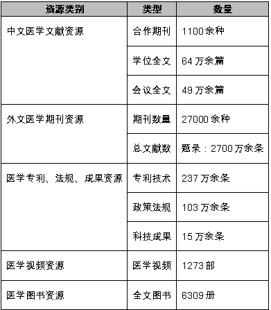 万方医学经过十几年的发展积累了海量、优质、全面的医学信息资源,包括中外文医学期刊论文、学位论文、会议论文、医学专利、法规、成果资源、医学视频资源、医学图书资源以及临床诊疗知识库资源。其中: 中文期刊收录中华医学会期刊144种,收录中国医师协会期刊24种;外文期刊收录全部Medline期刊;拥有完全自主知识产权的国内领先的中西医临床诊疗知识库;万方医学强大的医学资源内容可以为学校师生教育与学习专业知识提供丰富的学习资源和参考知识。