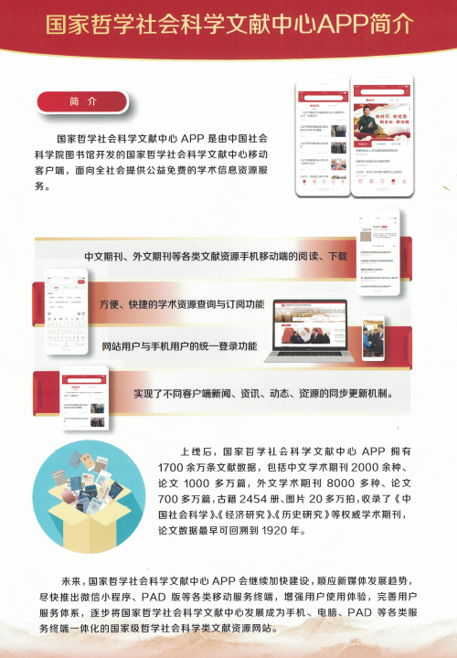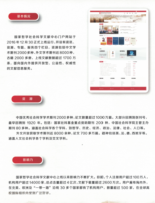 由中国社会科学院承建的“国家哲学社会科学学术期刊数据库”旨在建设成为我国国内最大的公益性社会科学精品期刊数据库,公益、开放。目前收录中国优秀社会科学学术期刊2000多种、论文数量超过1000万篇,外文开放获取学术期刊近8000余种,论文700多万篇,古籍2000多册。期刊大部分回溯到创刊号,最早回溯到1920年,收录国家社科基金遴选并重点资助的国内顶级社科类学术期刊200种,收录中国社会科学院主管主办期刊80多种,涵盖社会科学各个学科。收录期刊绝大部分入选中国社会科学院、北京大学、南京大学三大评价体系的核心期刊。