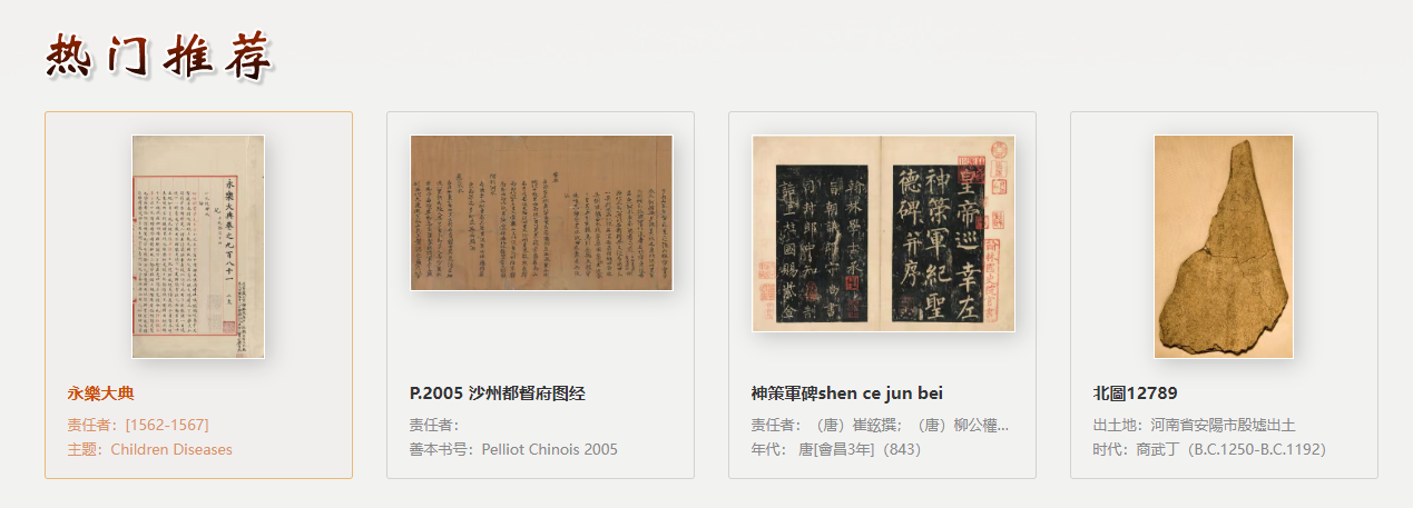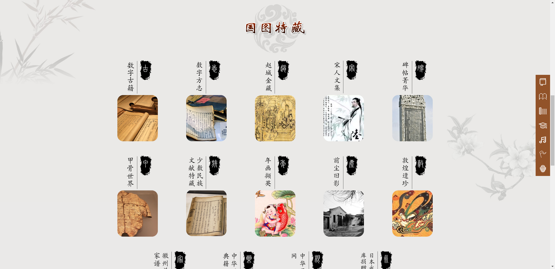 “中华古籍资源库”是国家图书馆(国家古籍保护中心)建设的综合性古籍特藏数字资源发布共享平台,是“中华古籍保护计划”的重要成果。该平台遵循边建设、边服务原则,目前在线发布资源包括国家图书馆藏善本和普通古籍、甲骨、敦煌文献、碑帖拓片、西夏文献、赵城金藏、地方志、家谱、年画、老照片等,以及馆外和海外征集资源,总量约10万部(件)。