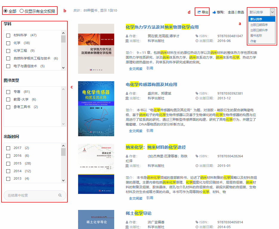 ·可对检索结果根据学科、图书类型、出版时间进行二次筛选。