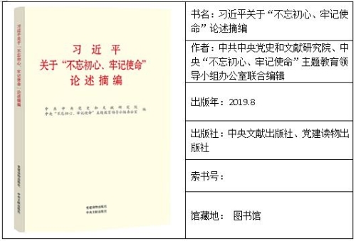内容简介:《摘编》内容摘自习近平总书记2012年11月15日至2019年7月16日期间的讲话、报告、文章、指示、批示等130多篇重要文献,分10个专题,共计362段论述。其中部分论述是第一次公开发表。中央“不忘初心、牢记使命”主题教育领导小组办公室强调,《摘编》是开展“不忘初心、牢记使命”主题教育的基本教材,是学习习近平总书记有关论述的重要读本。要把《摘编》纳入主题教育学习计划,组织党员认真学习,真正做到守初心、担使命,找差距、抓落实,更好地用习近平新时代中国特色社会主义思想武装头脑、指导实践、推动工作。